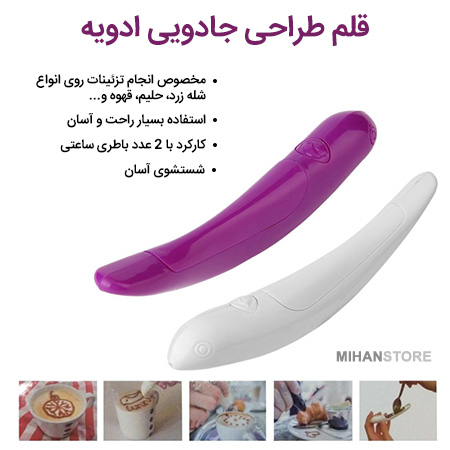 قلم طراحی جادویی برای تزیین انواع ماست ،شله زرد، حلیم، قهوه و ... هست که میتونید با داشتن اون یک طراحی فوق العاده راحت و زیبا داشته باشید . نحوه کار این قلم به صورتیه که مواد پودری دلخواهتون رو داخل اون پر میکنید و با فشردن دکمه اون ادویه ها و پودرها بیرون میاد و میتونید طرحتون رو راحت رسم کنید. این قلم برای یک پذیرایی عالی و طراحی انواع مواد غذایی و ... یک گزینه عالی برای خانم ها و بسیاری از کافی شاپ و رستوران ها به حساب میاد. این محصول با دو عدد باطری ساعتی قابل استفاده است.