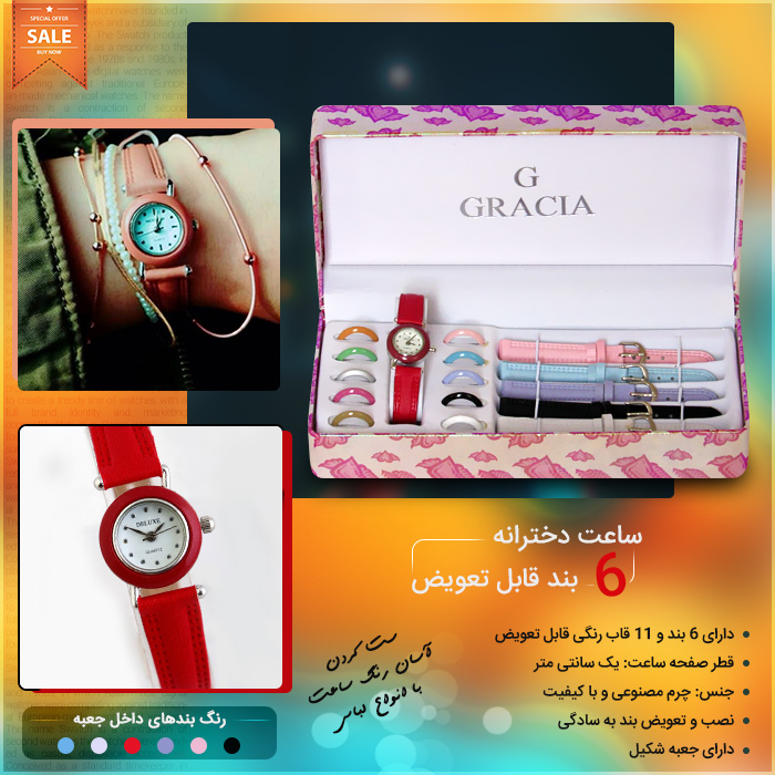 ویژگی های ساعت دخترانه 6 بند قابل تعویض :