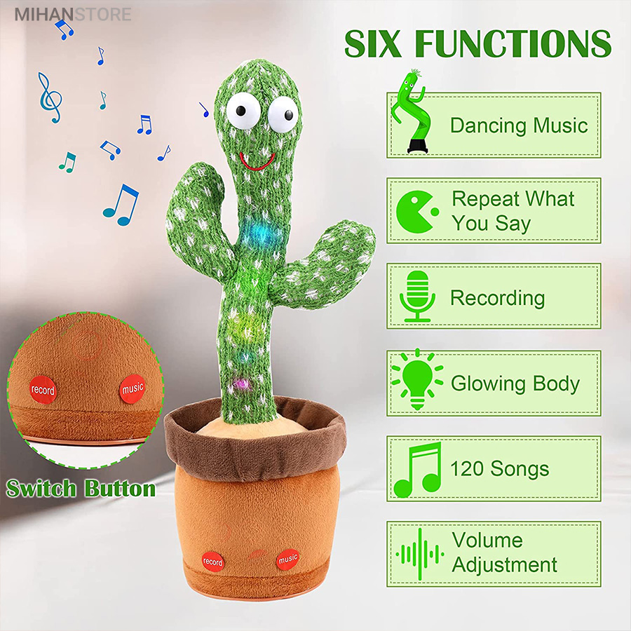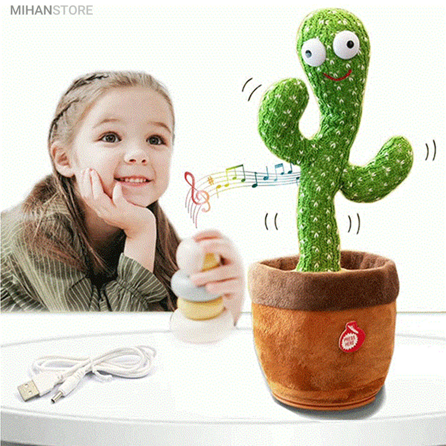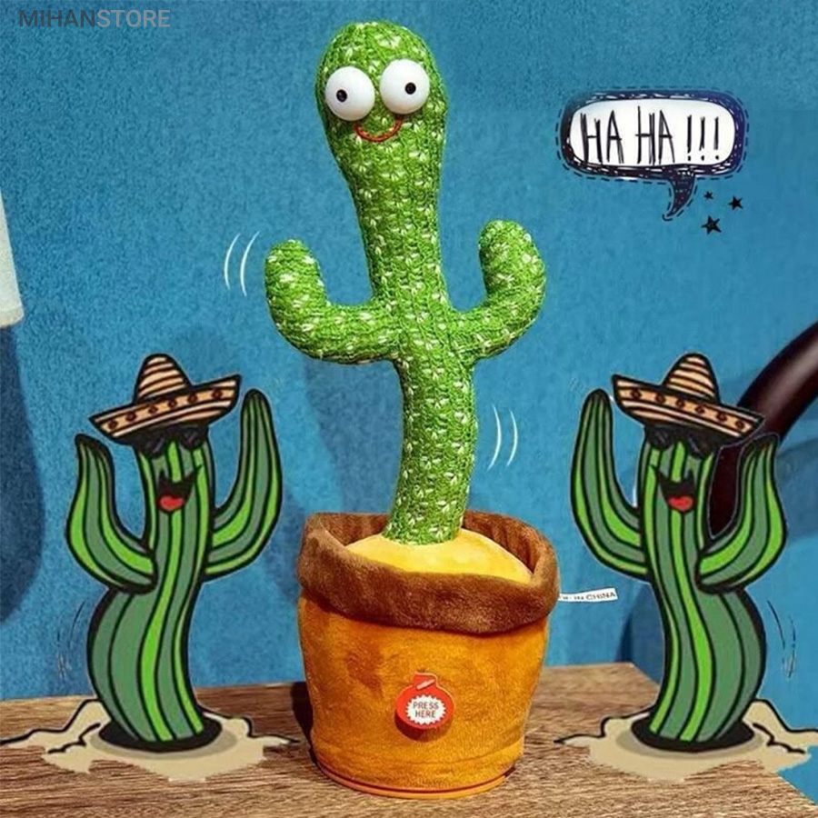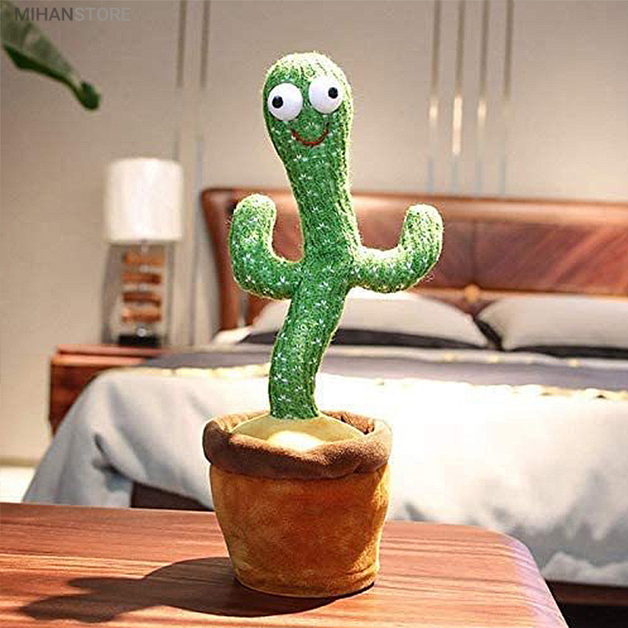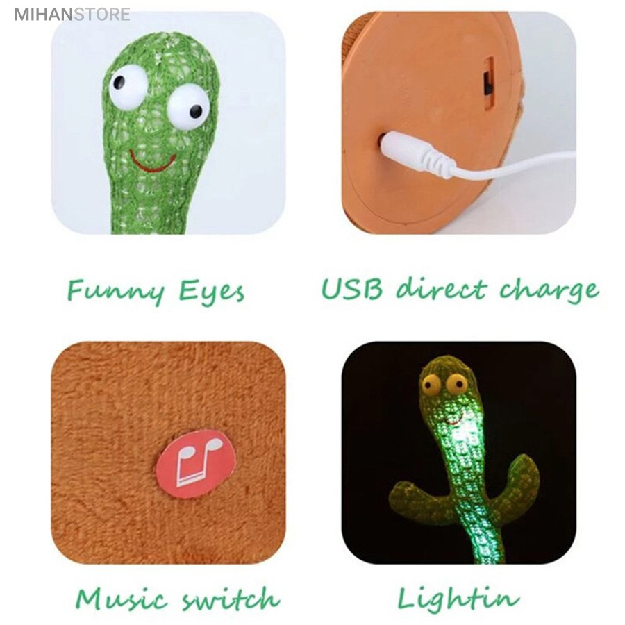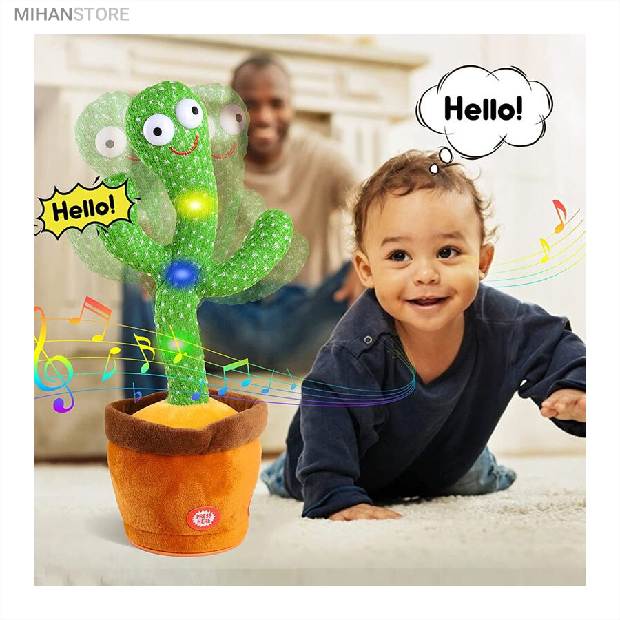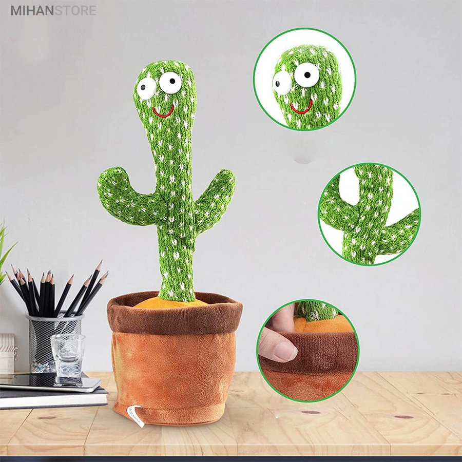 اسباب بازی مخمل زیبا و سرگرم کننده به شکل کاکتوس می تواند برقصد، آواز بخواند، حرکت موزون انجام دهد و صدای شما را تقلید کند. آن را شارژ کنید و و برای چند ساعت خود، اطرافیان و کودک خود را شاد کنید.  کافی است که کابل شارژ USB که در داخل جعبه بسته بندی این محصول قرار دارد را از جعبه در آوردید و از یک طرف به USB و از طرف دیگر به قسمت مخصوص در زیر عروسک (گلدان) متصل کنید. با اتصال کابل شارژ به آداپتور، چراغ قرمز رنگ داخل گلدان روشن می شود و وقتی که عروسک فول شارژ شد، به رنگ سبز تبدیل می شود.