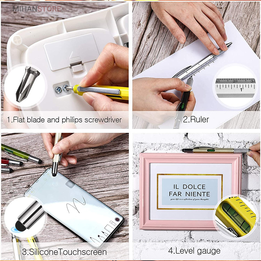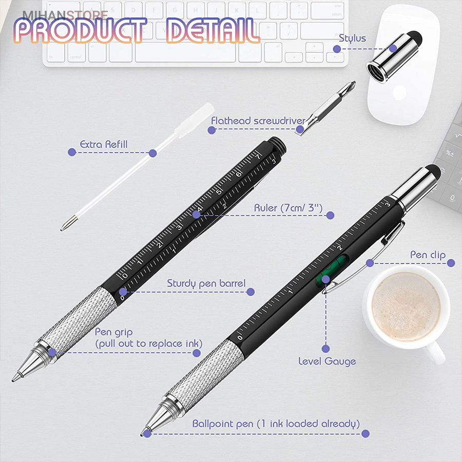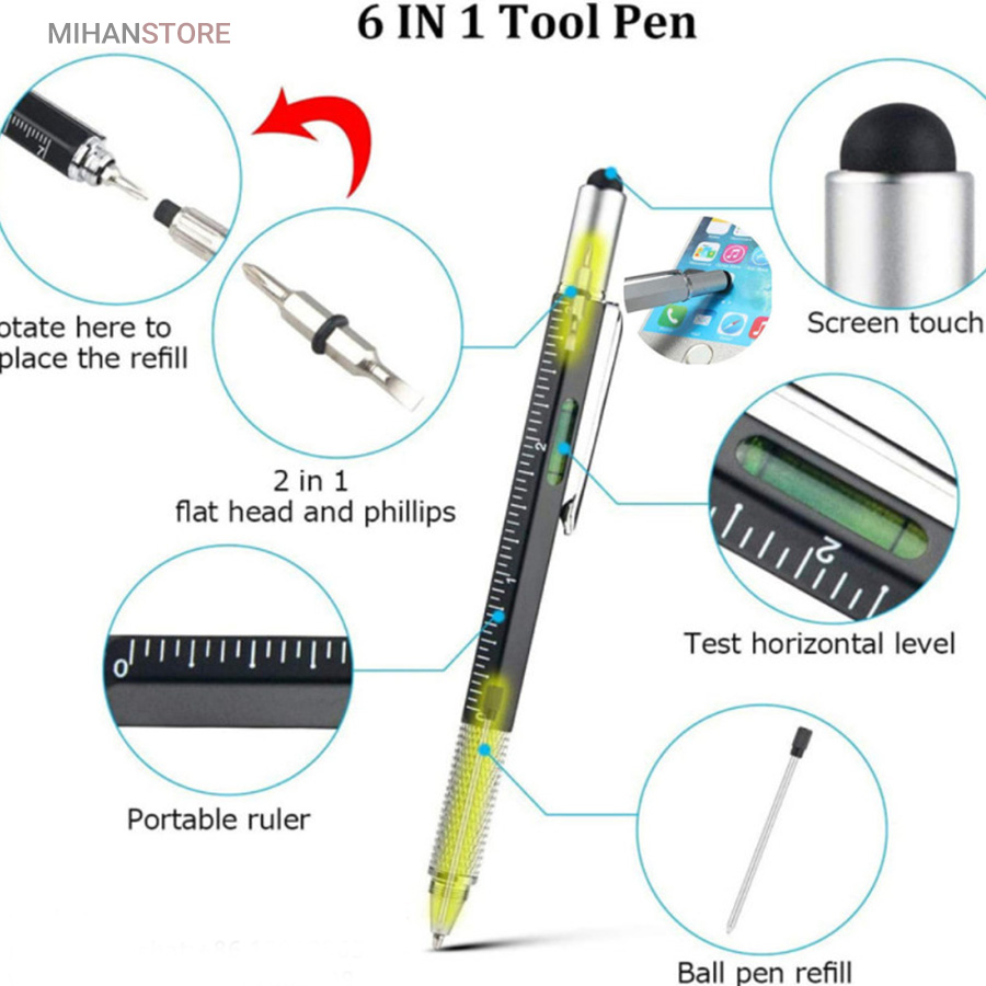 خودکار جادویی 6 کاره که می توانید از آن به عنوان خط کش، پیچ گوشتی، تراز سطح، قلم لمسی و خودکار استفاده کنید. این محصول دارای طراحی بدون لغزش و جوهر یکنواخت برای دست خطی صاف است. خودکار جادویی 6 کاره 16سانتی متر و از یک بدنه‌ی شش‌ضلعی و از فلز ساخته شده است که در دو وجه آن دو خط‌کش که سانتی متر و اینچ را اندازه گیری میکنند. جوهر خودکار آن نرم و بسیار روان است و با پیچ تنظیم موجود در بالای نوک خودکار، به درون و بیرون بدنه‌ی خودکار حرکت می‌کند. از دیگر ابزارهای این خودکار می‌توان به یک تراز کوچک روی بدنه نزدیک به سنجاق فلزی خودکار اشاره کرد. این تراز بسیار دقیق و کارآمد است. در قسمت انتهایی خودکار، یک برآمدگی لاستیکی مشکی‌رنگ وجود دارد که بسیار نرم بوده و مناسب استفاده در مواقع ضروری روی صفحه‌ی موبایل به‌عنوان ابزاری برای لمس‌کردن گوشی به جای انگشتان است. این قلم لمسی در قسمت انتهای خود دارای دو پیچ‌گوشتی ریز دوسو و چهارسوست از نوع فلز بسیار محکم که در مواقع لزوم می‌توانید درپوش انتهایی خودکار را باز کرده و از پیچ‌گوشتی‌هایی که روی خودکار سوار هستند، استفاده کنید. در آخر باید گفت این قلم لمسی می‌تواند گجت بسیار کارآمد در جیب شما باشد کیفیت رنگ این قلم ثابت بوده و در اثر مرور زمان رنگ ان تغییر نمیکند.
