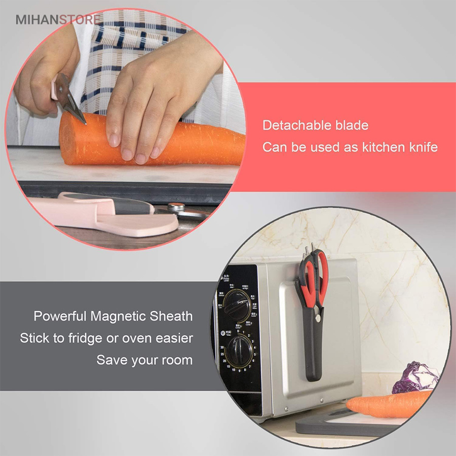 قیچی 8 کاره آشپزخانه یک قیچی منحصر به فرد است که با طراحی فوق العاده هوشمندانه ای که دارد می تواند چندین کار سنگین را با هم انجام دهد. در نگاه اول این محصول یک قیچی با تیغه های بسیار تیز که تیغه های تیز استیل ضدزنگ با لبه های دندانه دار برای جلوگیری از لغزش در هنگام برش میباشد میتوان از آن برای برش نان, میوه و سبزیجات و حتی مرغ و گوشت استفاده کرد اما پس از جدا کردن 2 تیغه ی این محصول از یکدیگر از کارایی بسیار بالای آن شگفت زده خواهید شد.اولین کاربرد هریک از تیغه ها استفاده به عنوان چاقویی بسیار تیز و کاربردی میباشد. در انتهای یکی از دسته های این قیچی قطعه ای فلزی قرار داده شده که میتوان از آن به عنوان درب باز کن , پیچ گوشتی 2 سو , لگه گیر سیب زمینی و حتی برای ایجاد سوراخ بر روی پوسته ی آهکی تخم مرغ استفاده کرد. از دیگر کاربردهای این قیچی میتوان به وجود پوست کن تیز بر روی یکی از تیغه ها اشاره کرد. ازویژگی های بسیار کاربردی این محصول تبدیل شدن یکی از تیغه ها به فلس گیر ماهی است که با چندحرکت به راحتی میتوان این کار را انجام داد.اما مهم ترین ویژگی این محصول که سبب تمایز آن با کالاهای مشابه میگردد خاصیت مگنتی این قیچی میباشد که به واسطه ی آن میتوانید قیچی را بر روی سطوح مختلف مانند یخچال نصب کرده و به این ترتیب قیچی بدون خطر برای فرزندانتان در دسترس شما باشد.