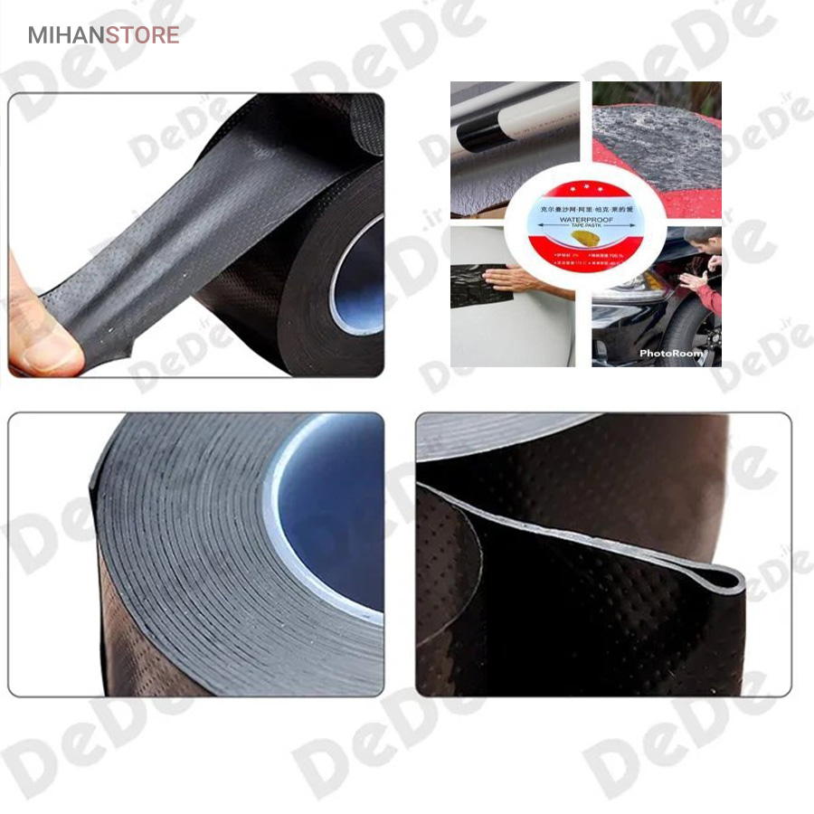 چسب آب بندی نواری نمونه ای جدید از ابزار پوشش محسوب می شود که دارای سطح رویین شبکه ای به رنگ مشکی می باشد ، خصوصیتی که زیبایی ظاهری را برای آن تا حدی پدید آورده ، به طوری که بتوان از کالا در بیشتر موقعیت های مکانی بدون نگرانی از تخریب شکل ظاهری استفاده نمود . سطح زیرین محصول ، لایه ای چسبی وجود دارد که چسبندگی بسیار خوبی را دارا است ، به طوری که به اغلب سطوح می توان آن را چسباند و استفاده کرد ، البته با دقت به این موضوع که بهترین عملکرد برای کالا روی سطح یکدست (مسطح) ، بدون برجستگی است . پهنای چسب درزگیر ، 5 سانتی متر با طول 5 متر می باشد که می توانید از آن برای پوشش ترک سطوح مختلف استفاده کنید ، کافی است سطح مورد نظر را تمیز کنید و در نهایت برچسب را روی منافذ ، ترک و یا شیار مورد نظر به خوبی بچسبانید به طوری که کامل آن پوشش دهد . برچسب آب بندی ، مقاومت لازم در برابر آب را نیز دارد بنابراین کمترین محدودیت ممکن در استفاده از آن را خواهید داشت .