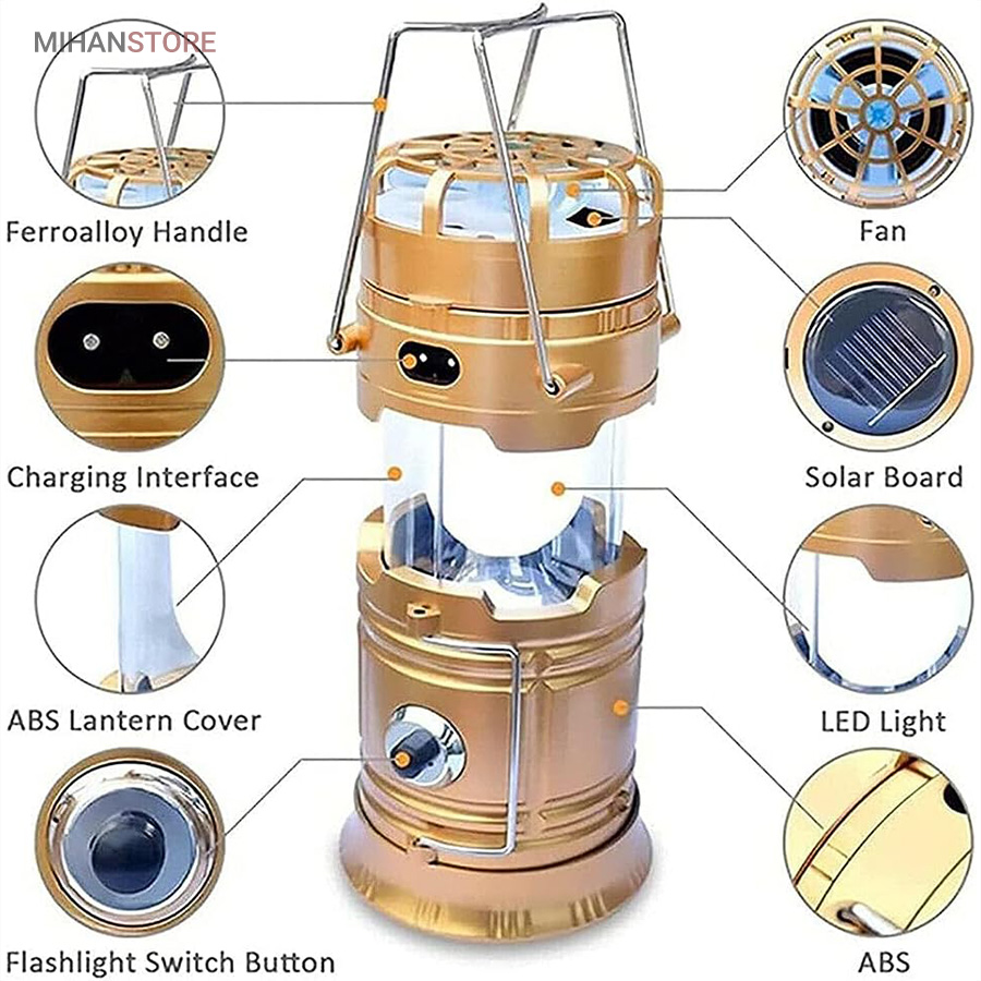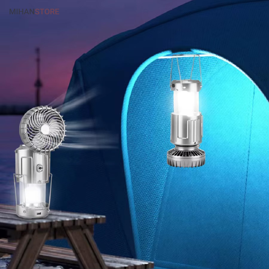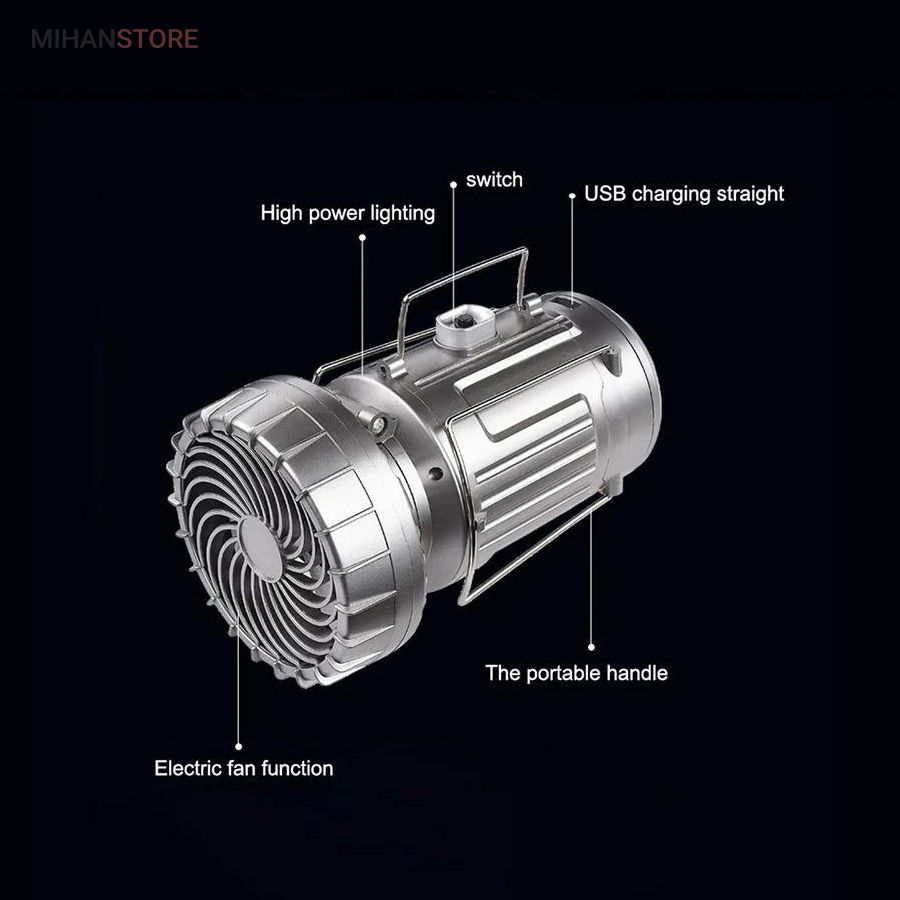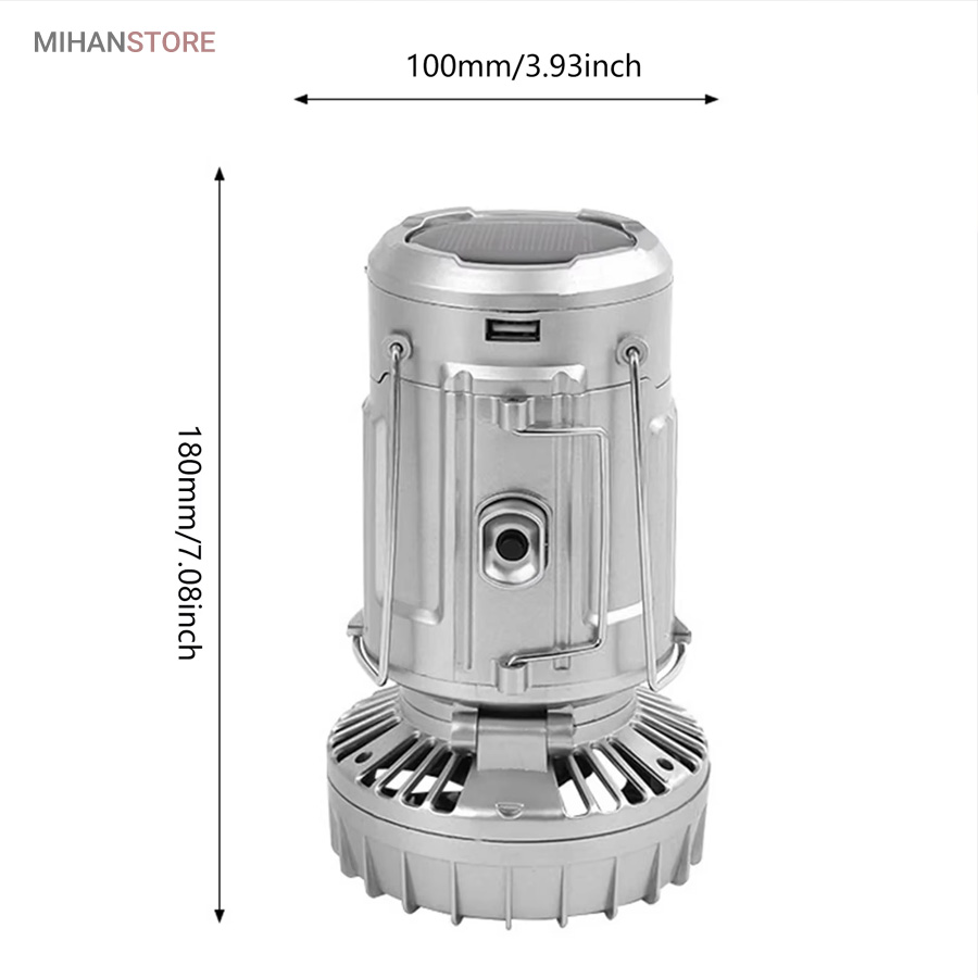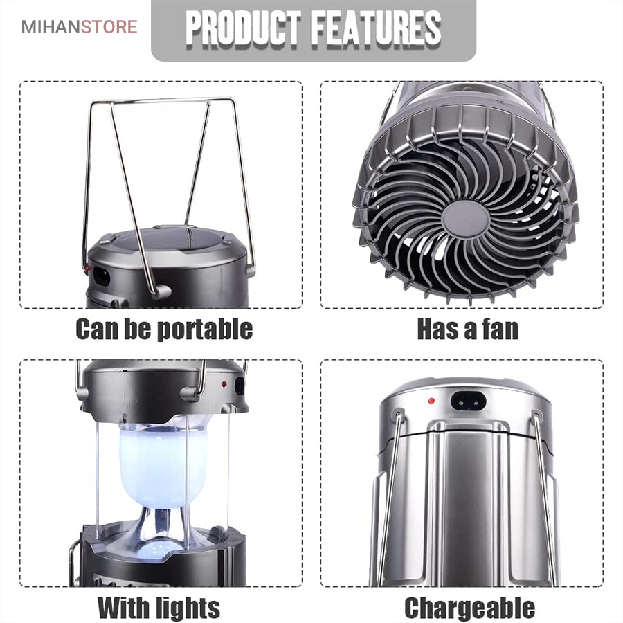 چراغ کمپینگ خورشیدی دارای پنکه و پاوربانک محصولی ساده درعین‌حال کاربردی است که می‌تواند در زمان سفر یا در شرایط اضطراری در شهر مورد استفاده قرار گیرد. در قسمت بالایی این فانوس، دو دسته‌ی فلزی قرار دارد؛ به همین دلیل می‌توان آن را داخل چادر یا هر سطح برجسته‌ای آویزان کرد و از نور آن بهره برد. چراغ کمپینگ و پاوربانک خورشیدی چندکاره همراه خوبی برای سفر به طبیعت، کوه‌نوردی و پیاده‌روی در هنگام شب هستند. گاهی ما به مکانی سفر می‌کنیم که نور کافی در آن وجود ندارد؛ در این صورت، داشتن یک لامپ فانوسی بسیار ضروری به نظر می‌رسد. همچنین از لامپ آن به‌صورت کشویی استفاده خواهید کرد و در صورت نیاز می‌توانید آن را باز کرده، به‌راحتی از روشنایی این لامپ فانوسی بهره‌مند شده و محیط پیرامون خود را روشن کنید. چراغ کمپینگ و پاوربانک خورشیدی چندکاره انتخابی خوب و باکیفیت برای داشتن سفری خوش است که می‌توانید از آن برای روشن‌کردن چادر، اتومبیل یا هر محیط تاریک دیگری استفاده کنید.