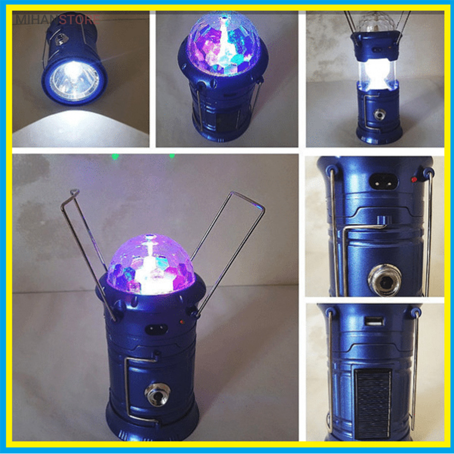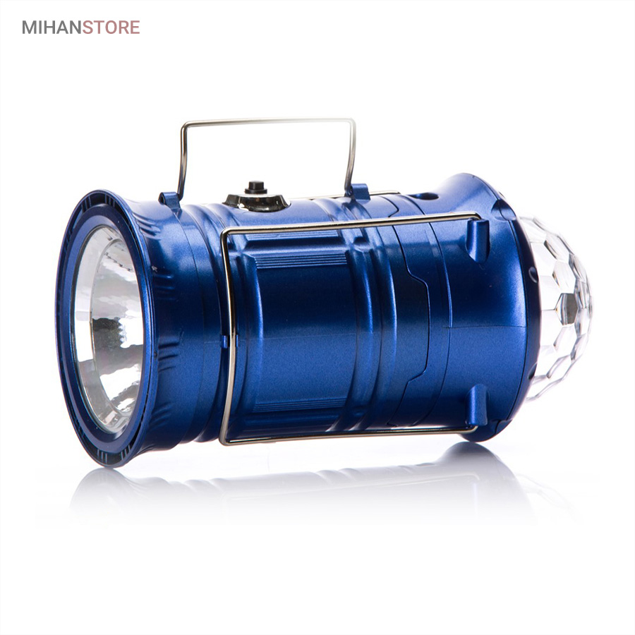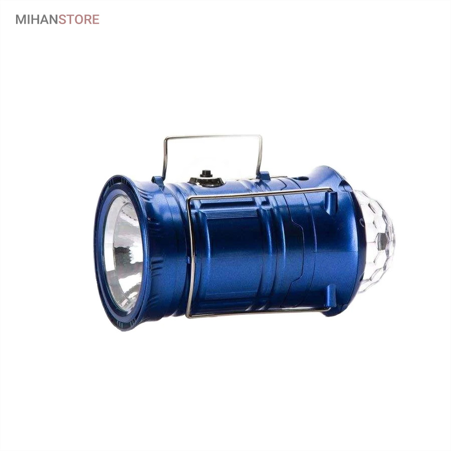 چراغ کمپینگ شارژی رقص نور دار قابل حمل به همراه رقص نور، محصولی با طراحی نوین و بسیار کاربردی است ‏.‏ این چراغ را می‌توان تلفیقی از فانوس های قدیمی و چراغ قوه های جدید و رقص نور مدرن دانست .‏چراغ کمپینگ شارژی رقص نور دار، در واقع یک ابزار چند کاره است و می‌تواند به سادگی نیاز های شما در رابطه با نور را در مسافرت، پیک نیک و جشن های خانواگی و مواردی نظیر آن فراهم کند .‏ شما می‌توانید با کشیدن سر چراغ به سمت بالا ‏(‏کشویی‏)‏، فانوس را روشن کنید و از آن برای تأمین نور محیط استفاده نمایید‏.‏ چراغ اصلی فانوس دارای 6 چراغ ال ای دی است که در کنار هم نور قوه ای را ایجاد می‌کنید‏.‏ همچنین در بالای این فانوس یک شیشه منشوری وجود دارد که هنگام روشن کردن با چرخش و نور پردازی فضای دل انگیزی را برای شما به وجود می‌آورد‏.‏ این محصول خرید خوبی برای استفاده در کمپینگ و طبیعت‌گردی خواهد بود.ورودی برق روی دستگاه بوسیله سیم همراه به برق وصل شده و چراغ را شارژ می‌نماید تا بتوانید به صورت بی سیم از چراغ استفاده نمایید.خروجی یو اس بی روی دستگاه نیز برای شارژ تلفن همراه شما تعبیه شده است و برای شارژ کردن گوشی موبایلتان است.جنس بدنه‌ی این محصول سبک و کم حجم، جنس بدنه از ABS + PC، محکم و بادوام است که به‌سادگی آسیب نمی‌بیند و این امکان را به شما می‌دهد تا مدت‌زمان زیادی به‌صورت مستمر از آن استفاده کنید. این محصول وزن قابل‌قبولی دارد و شما می‌توانید به‌راحتی آن را حمل کنید و در سفر‌ها به‌ همراه داشته باشید.