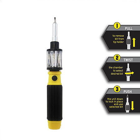این پیچ گوشتی همه کاره انقلابی در تولید ابزار آلات بوده که با استفاده از آن شما 6 ابزار را فقط در یک دستگاه خواهید داشت. این ابزار قابلیت چرخش 360 درجه را دارا است که سبب شده تا شما به راحتی در هنگام کار با این محصول بتوانید انواع پیچ را باز و بسته نمایید.از دیگر ویژگی های این پیچ گوشتی دسته ارگونومیکی مخصوص آن بوده که از سر خوردن پیچ گوشتی از دست شما جلوگیری می کند. همچنین شما با این وسیله دیگر نگرانی ناشی از گم کردن ابزارهایتان نخواهید داشت و فقط کافی است سری مورد نیاز خود را انتخاب کرده و کار خود را انجام دهید. از این ابزار می توانید در منزل، ماشین و محل کار استفاده نمایید.