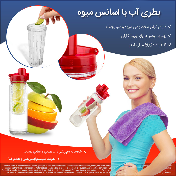 بطری آب با اسانس میوه Detox Water محصولی جدید با طراحی بسیار عالی و خلاقانه است که توانسته است خیلی زود به محبوبیت بسیار بالایی رسیده و پرطرفدار نیز شود همانطور که از نام محصول قمقمه آب با اسانس میوه دتوکس مشخص است در طراحی این محصول یک فضای مناسب برای قرار گیری اسانس میوه و سبزیجات قرار داده شده است که شما می توانید میوه هایی مانند لیمو و توت فرنگی و خیار و سیب و نعنا و غیره را به آن اضافه کنید و سپس آب را به قمقمه اضافه کنید و با اینکار شما می توانید آب را با طعم و عطری که دوست دارید بنوشید. بطری آب با اسانس میوه دتوکس علاوه بر ویژگی های گفته شده دارای کیفیت ساخت بسیار بالایی نیز می باشد و از بهترین مواد اولیه ساخته و طراحی شده است. بطری آب با اسانس میوه دارای فضای بسیار مناسبی نیز برای نگه داری آب بوده این محصول یک همراه عالی برای رفع تشنگی و همچنین انتخابی بسیار مناسب برای ورزشکاران و رفع تشنگی در هنگام انجام ورزش می باشد.